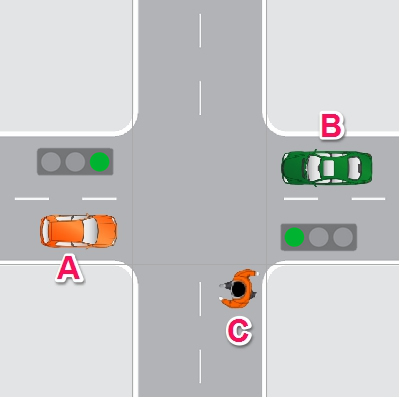 (28/362) 在下面的路口中,车辆A与B面对绿色信号灯,而行人C正在横穿马路。此时谁有路权?